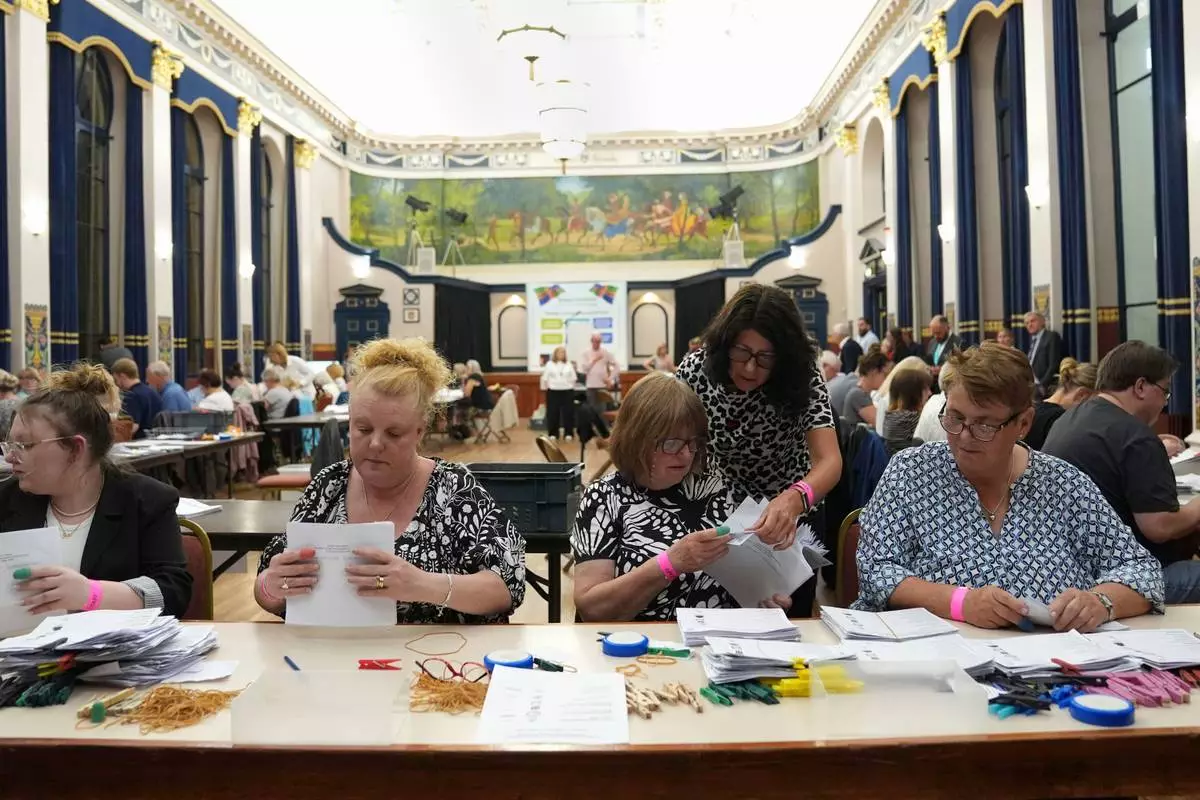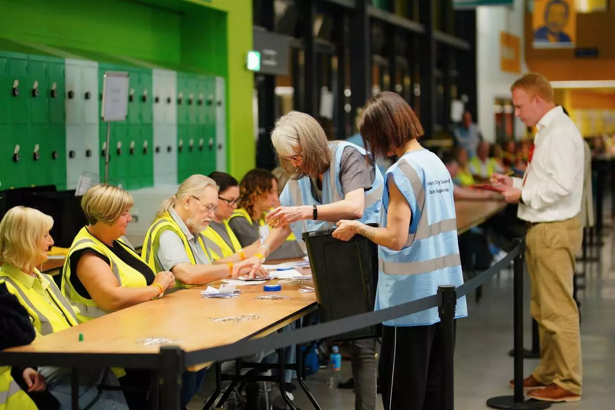 Votes are counted at Grimsby Town Hall, in Lincolnshire, for the Greater Lincolnshire Mayor election, Thursday, May 1, 2025. (Joe Giddens/PA via AP)