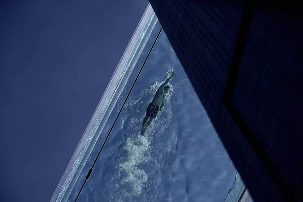 A man swims in the Sky Pool on a sunny day in London, Thursday, May 1, 2025. (AP Photo/Kin Cheung)