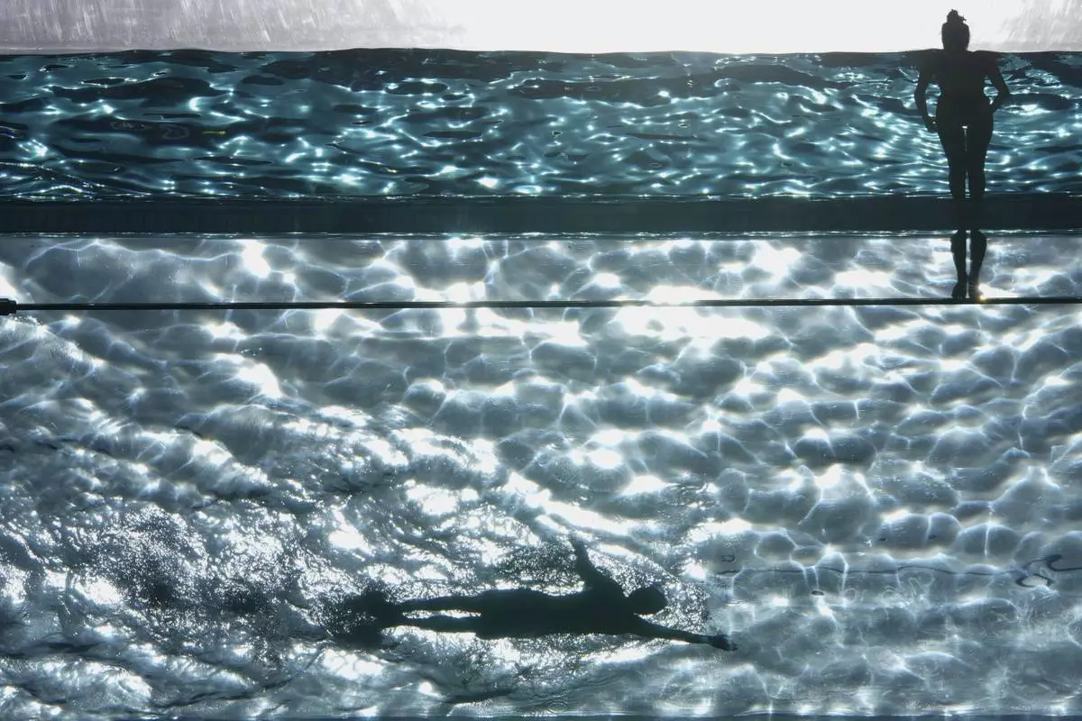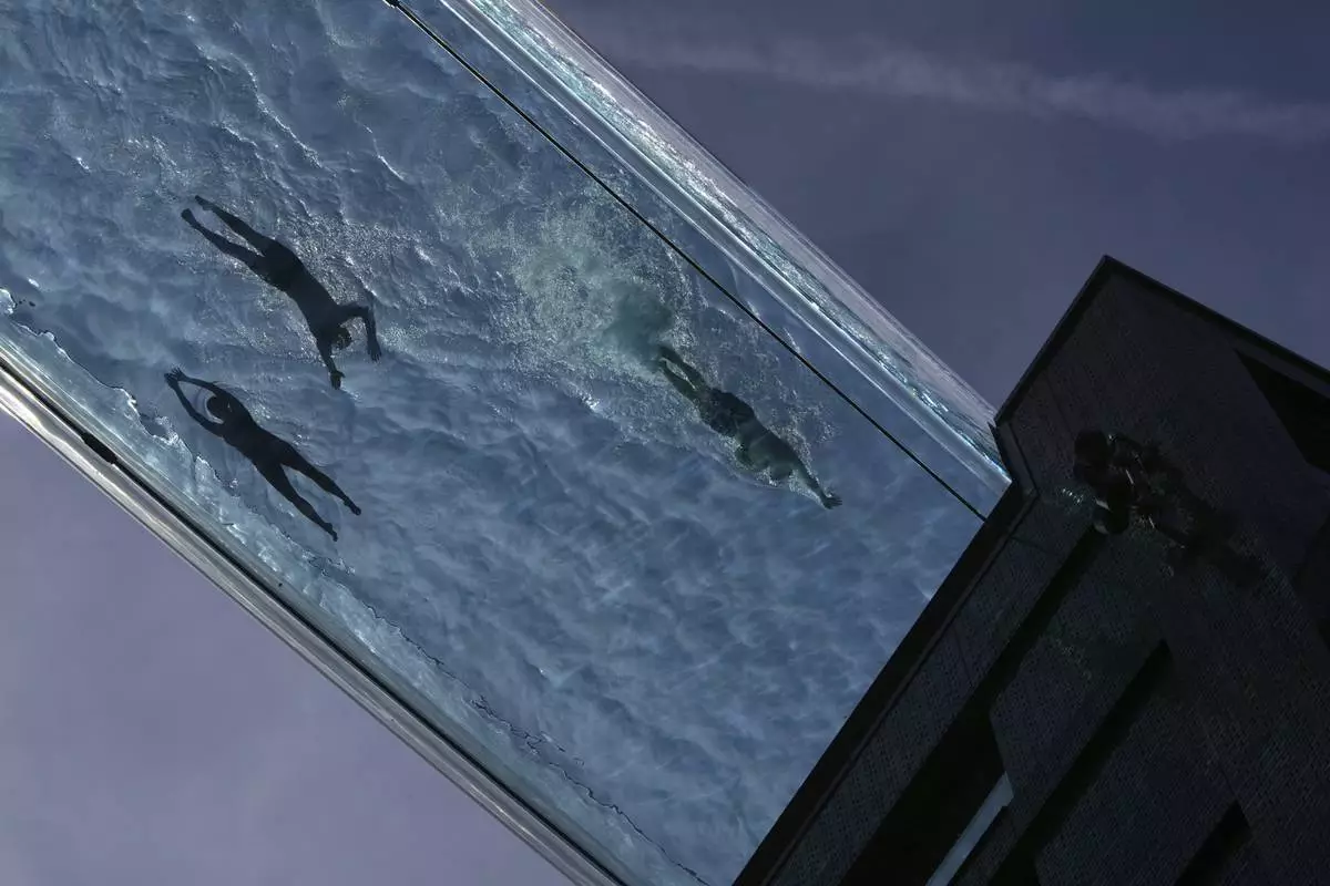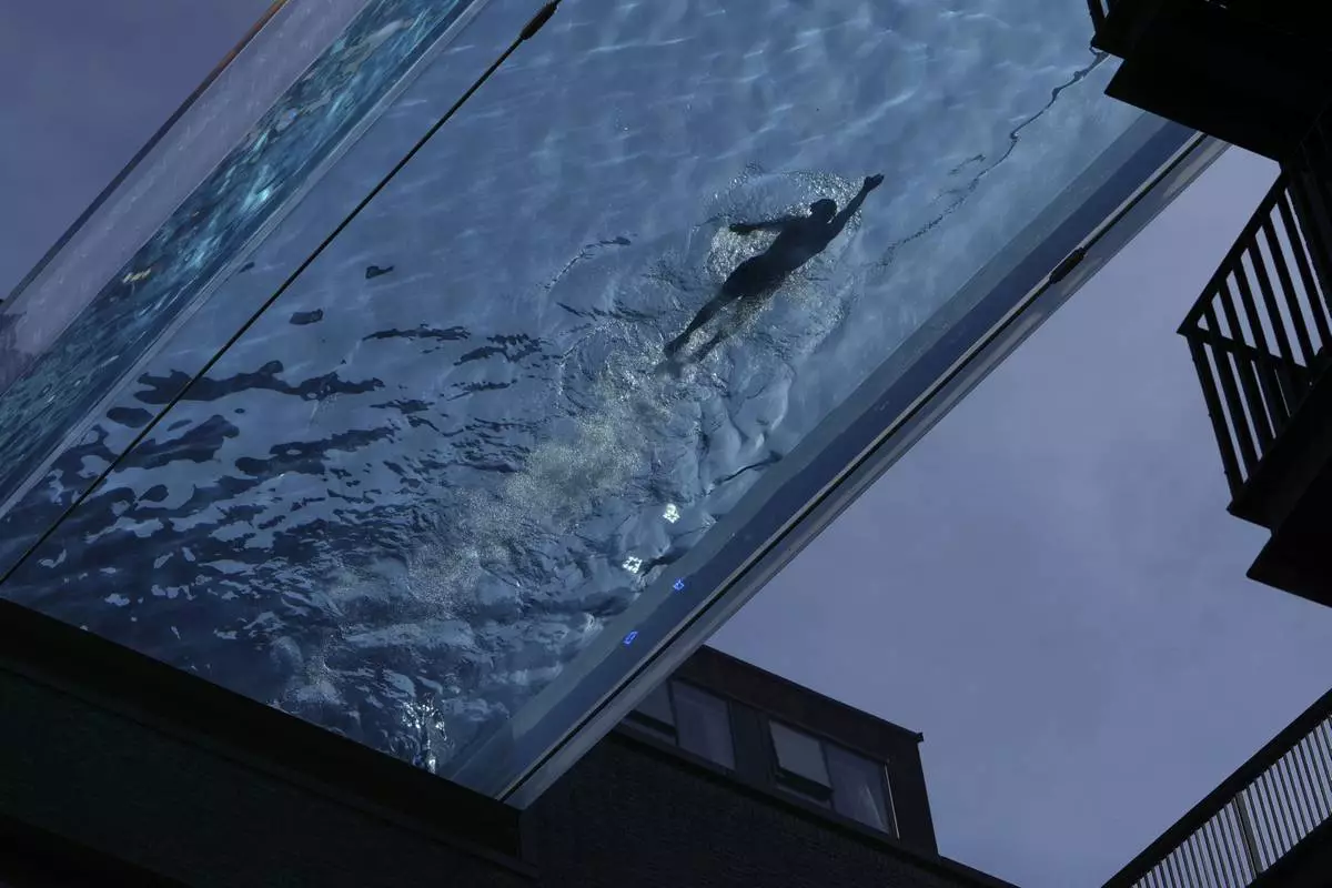 People swim in the Sky Pool on a sunny day in London, Thursday, May 1, 2025. (AP Photo/Kin Cheung)