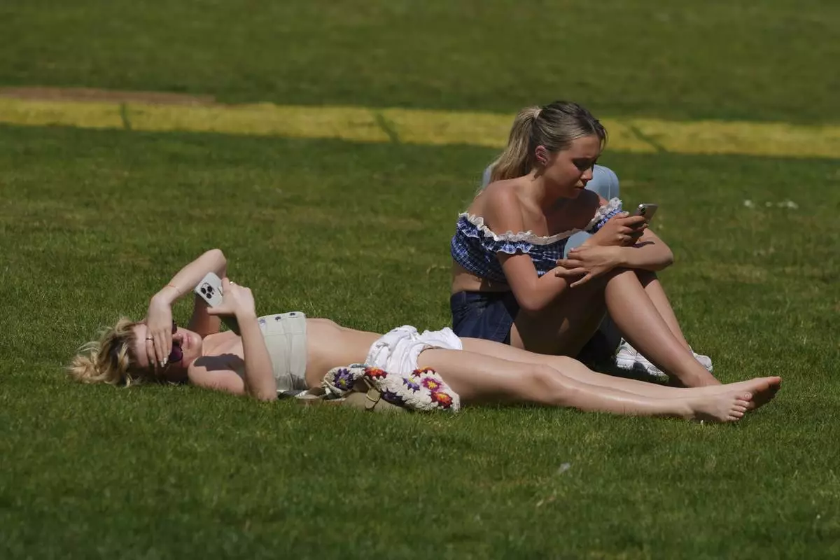 People sunbathe on a sunny day at a park in London, Wednesday, April 30, 2025. (AP Photo/Kin Cheung)
