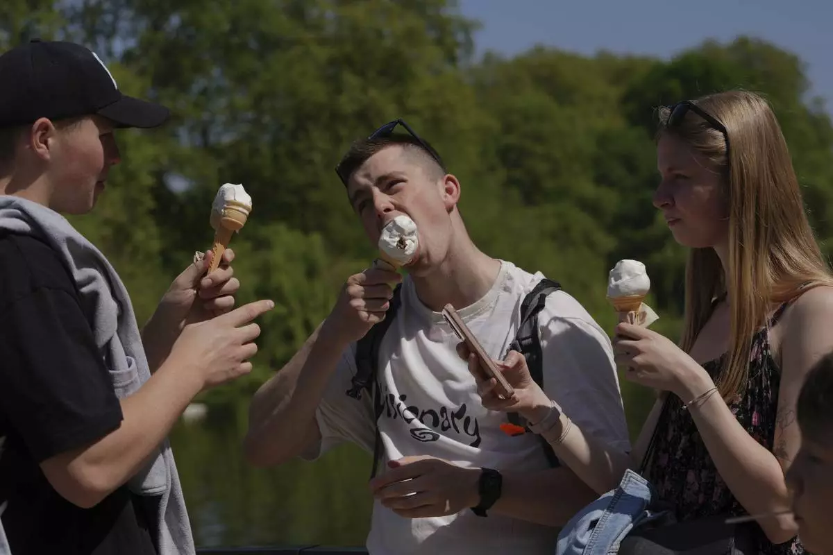 People have ice-cream on a sunny day at a park in London, Wednesday, April 30, 2025. (AP Photo/Kin Cheung)