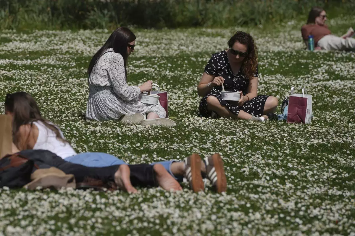 People have lunch on a sunny day at a park in London, Wednesday, April 30, 2025. (AP Photo/Kin Cheung)