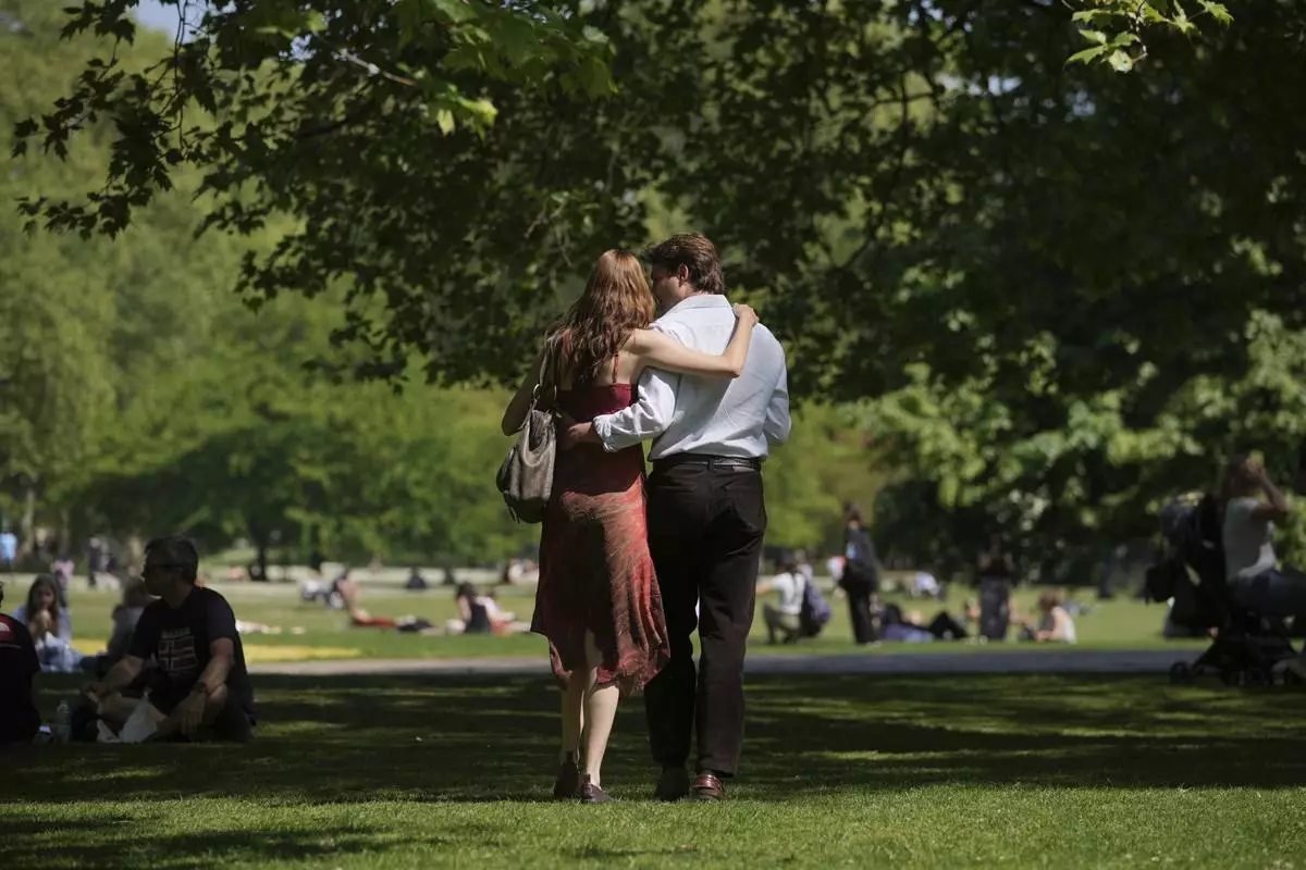 A couple walk on a sunny day at a park in London, Wednesday, April 30, 2025. (AP Photo/Kin Cheung)