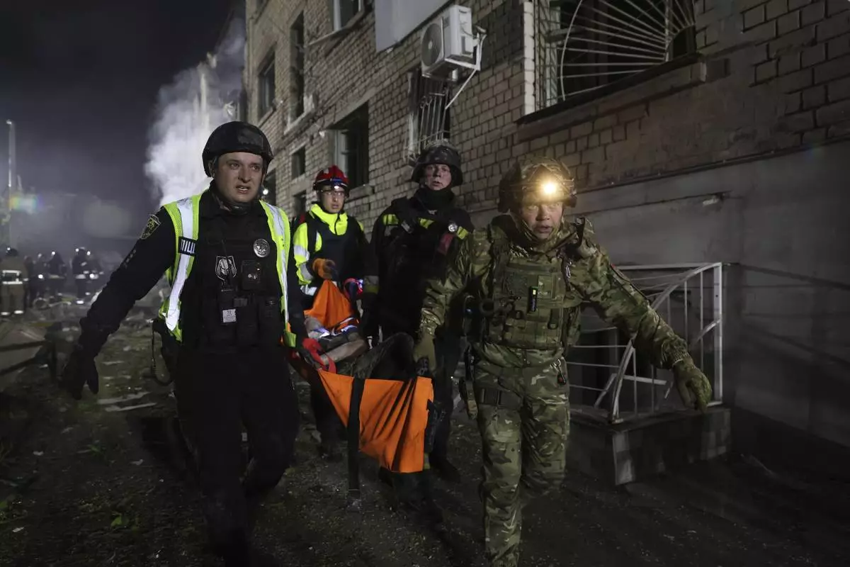 Police officers carry an injured man on a stretcher after a Russian strike on residential neighbourhood in Zaporizhzhia, Ukraine, Thursday, May 1, 2025. (AP Photo/Kateryna Klochko)