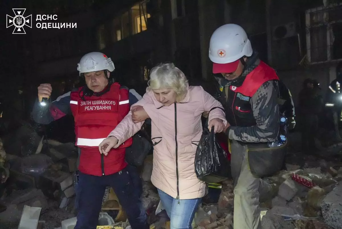 In this photo provided by the Ukrainian Emergency Service, a rescuer helps evacuate residents from their damaged house following Russia's air raid in Odesa, Ukraine, Thursday, May 1, 2025. (Ukrainian Emergency Service via AP)