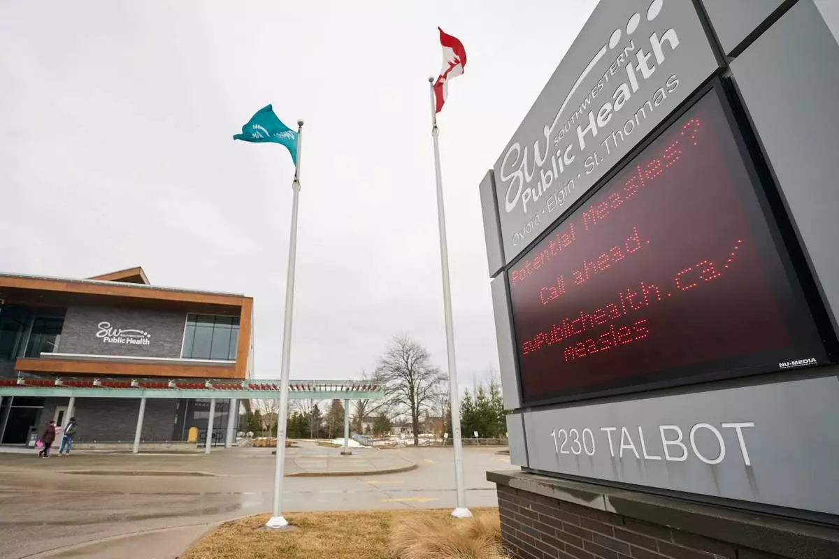 A sign outside Southwestern Public Health in St. Thomas, Ontario, Canada, on Tuesday, March 4, 2025, warns residents to call ahead before visiting a doctor or hospital if they think they have the measles. (Geoff Robins/The Canadian Press via AP)