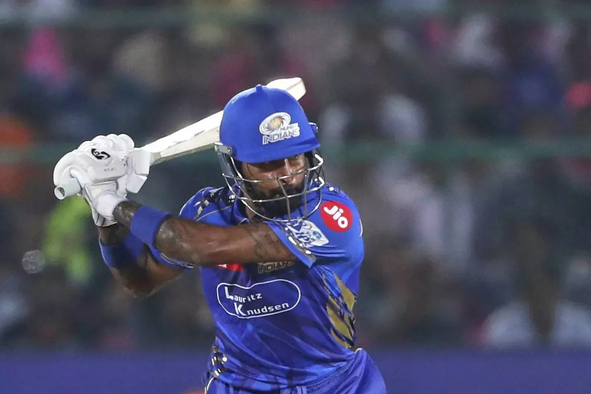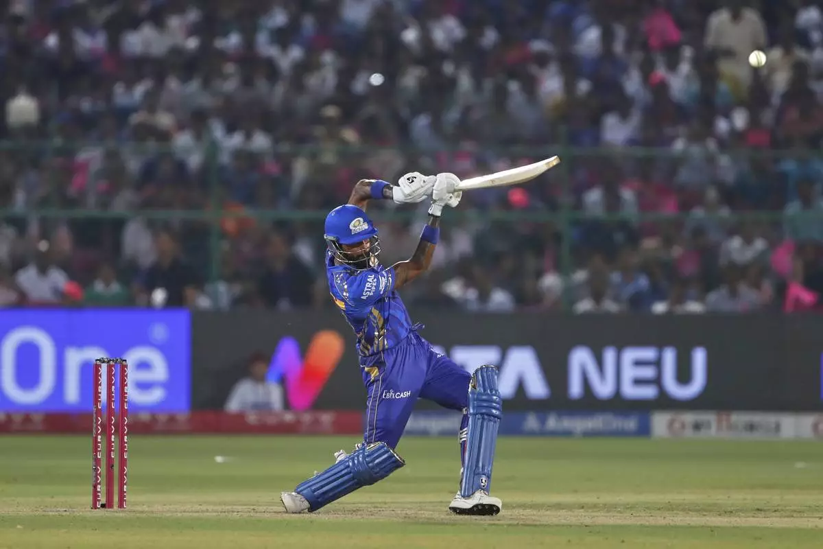 Mumbai Indians' captain Hardik Pandya plays a shot during the Indian Premier League cricket match between Rajasthan Royals and Mumbai Indians at Sawai Mansingh Stadium in Jaipur, India, Thursday, May 1, 2025. (AP Photo/Surjeet Yadav)