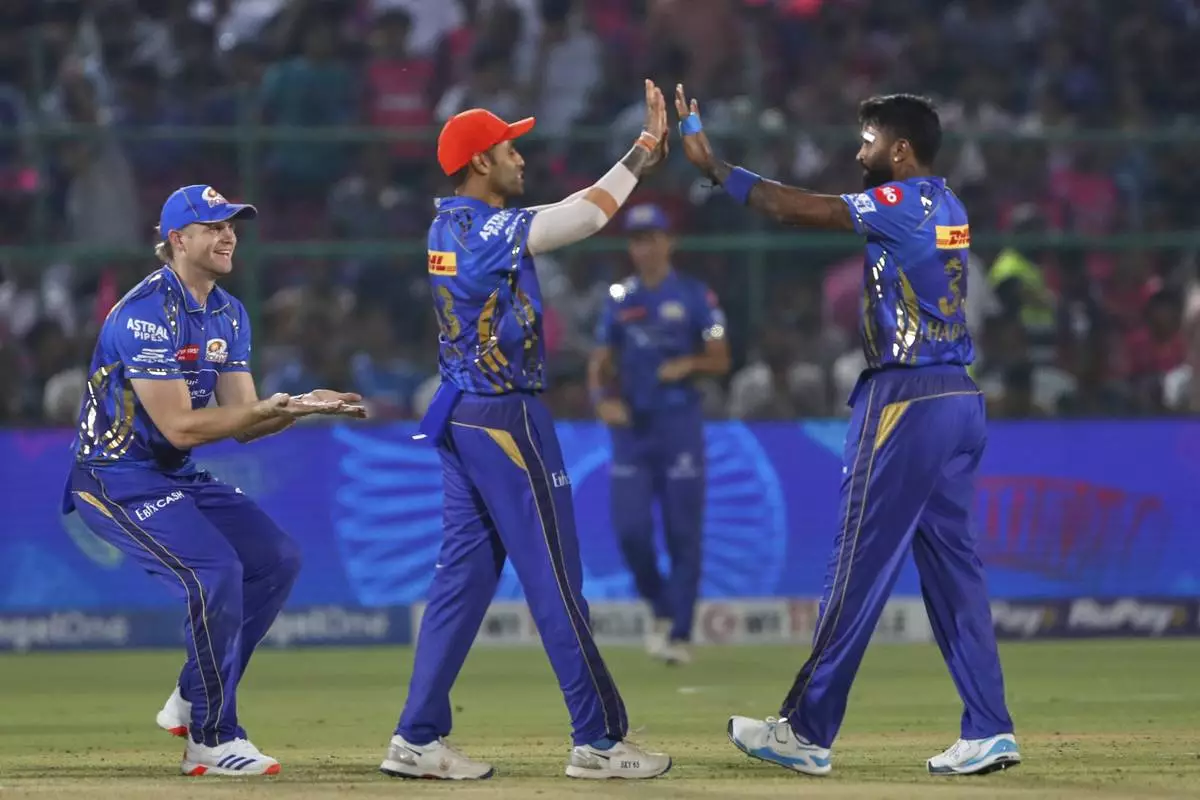 Mumbai Indians celebrates the dismissal of Rajasthan Royals' Vaibhav Suryavanshi rduring the Indian Premier League cricket match between Rajasthan Royals and Mumbai Indians at Sawai Mansingh Stadium in Jaipur, India, Thursday, May 1, 2025. (AP Photo/Surjeet Yadav)