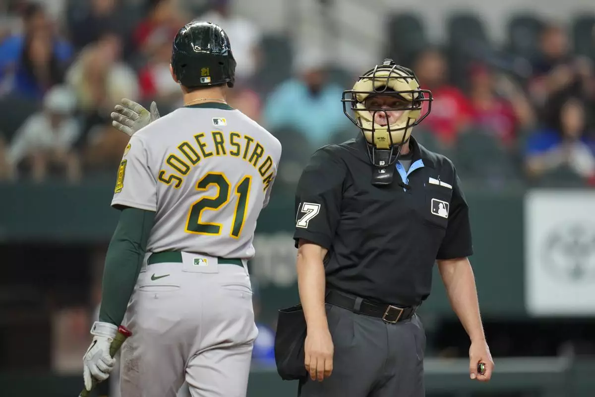 Oakland Athletics' Tyler Soderstrom (21) reacts after being called out on strikes by home plate umpire DJ Reyburn during the ninth inning of a baseball game against the Texas Rangers Thursday, May 1, 2025, in Arlington, TX. (AP Photo/Julio Cortez)