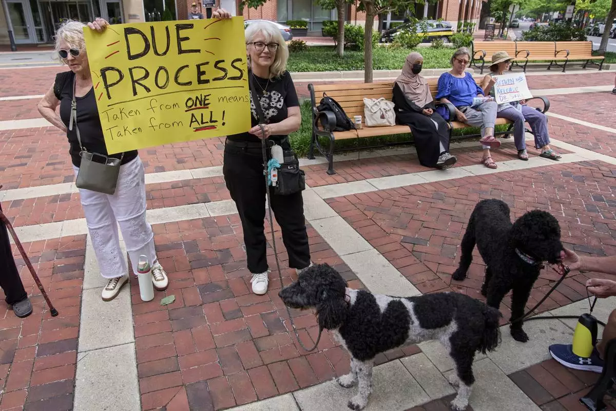 Maxine Columbia, right, of Alexandria, Va., rallies in support of Badar Khan Suri and in opposition to the Georgetown University scholar's arrest and detention, outside his courthouse hearing, in Alexandria, Va., Thursday, May 1, 2025. (AP Photo/Jacquelyn Martin)