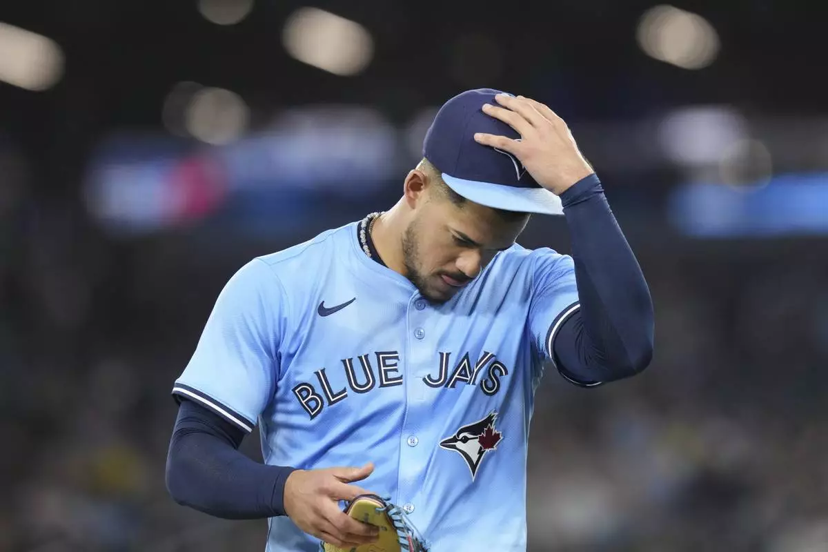 Toronto Blue Jays pitcher Jose Berrios returns to the dugout after first-inning baseball game action against the Boston Red Sox in Toronto, Thursday, May 1, 2025. (Chris Young/The Canadian Press via AP)
