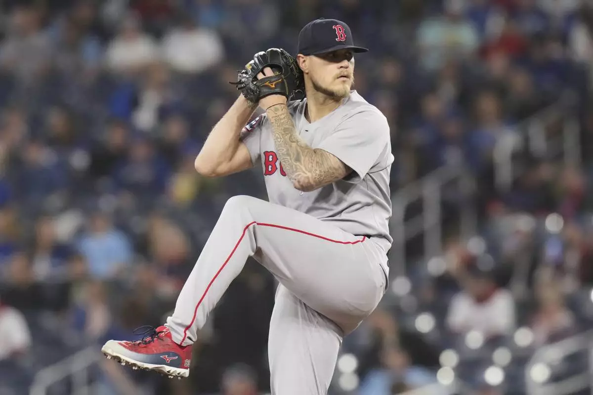 Boston Red Sox pitcher Tanner Houck works against the Toronto Blue Jays during first-inning baseball game action in Toronto, Thursday, May 1, 2025. (Chris Young/The Canadian Press via AP)