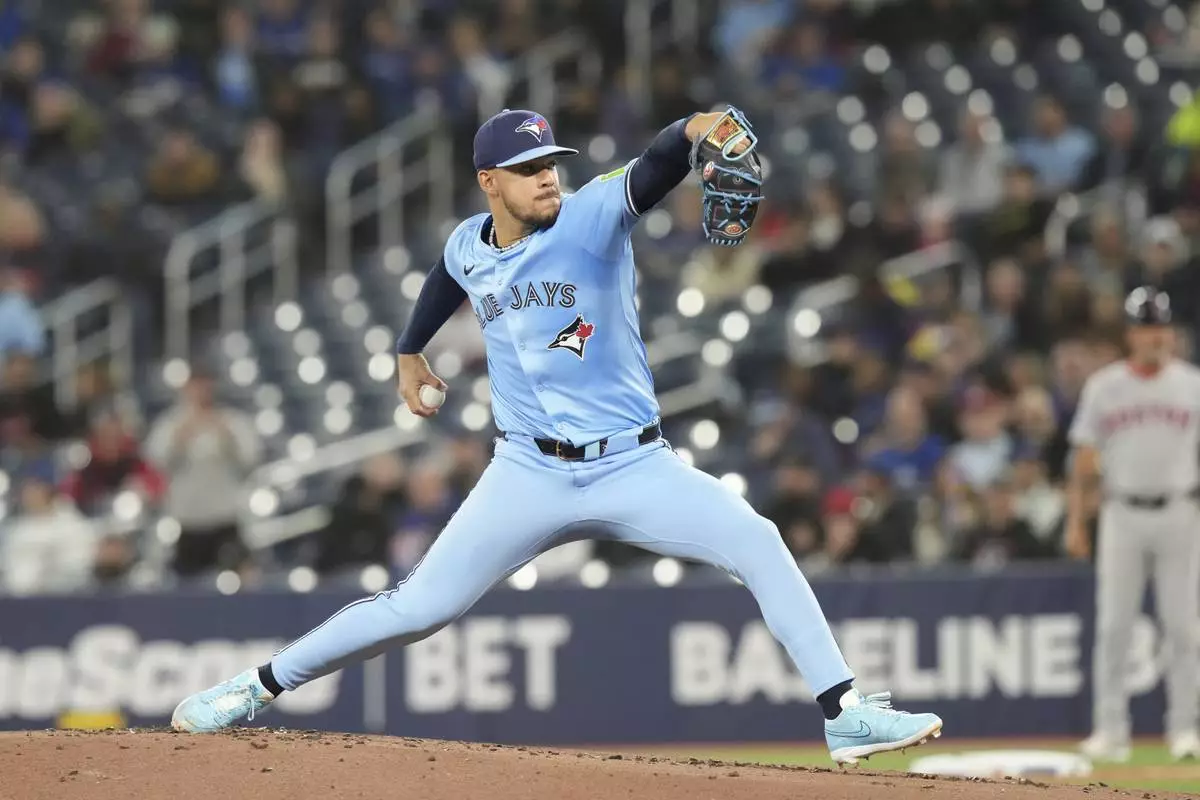 Toronto Blue Jays pitcher Jose Berrios works against the Boston Red Sox during first-inning baseball game action in Toronto, Thursday, May 1, 2025. (Chris Young/The Canadian Press via AP)