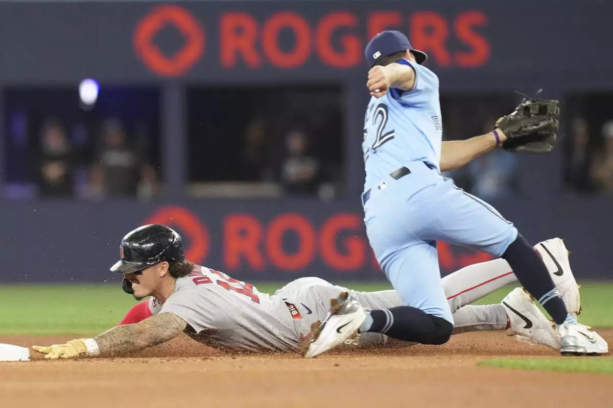 Boston Red Sox's Jarren Duran, left, steals second against Toronto Blue Jays second baseman Ernie Clement, right, during first-inning baseball game action in Toronto, Thursday, May 1, 2025. (Chris Young/The Canadian Press via AP)