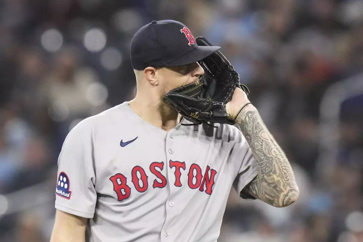 Boston Red Sox pitcher Tanner Houck reacts during second-inning baseball game action against the Toronto Blue Jays in Toronto, Thursday, May 1, 2025. (Chris Young/The Canadian Press via AP)