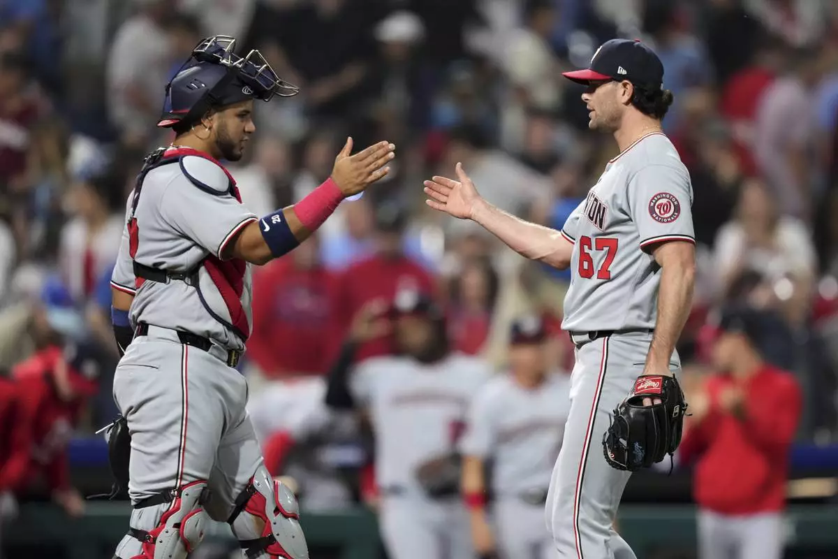 Washington Nationals pitcher Kyle Finnegan, right, and catcher Keibert Ruiz celebrate after the Nationals won a baseball game against the Philadelphia Phillies, Thursday, May 1, 2025, in Philadelphia. (AP Photo/Matt Slocum)