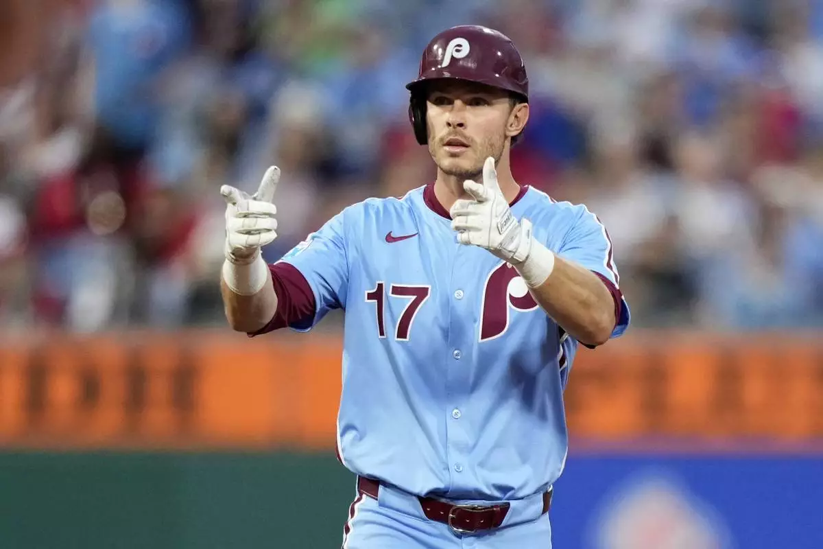 Philadelphia Phillies' Max Kepler reacts after hitting a double against Washington Nationals pitcher Brad Lord during the fifth inning of a baseball game, Thursday, May 1, 2025, in Philadelphia. (AP Photo/Matt Slocum)