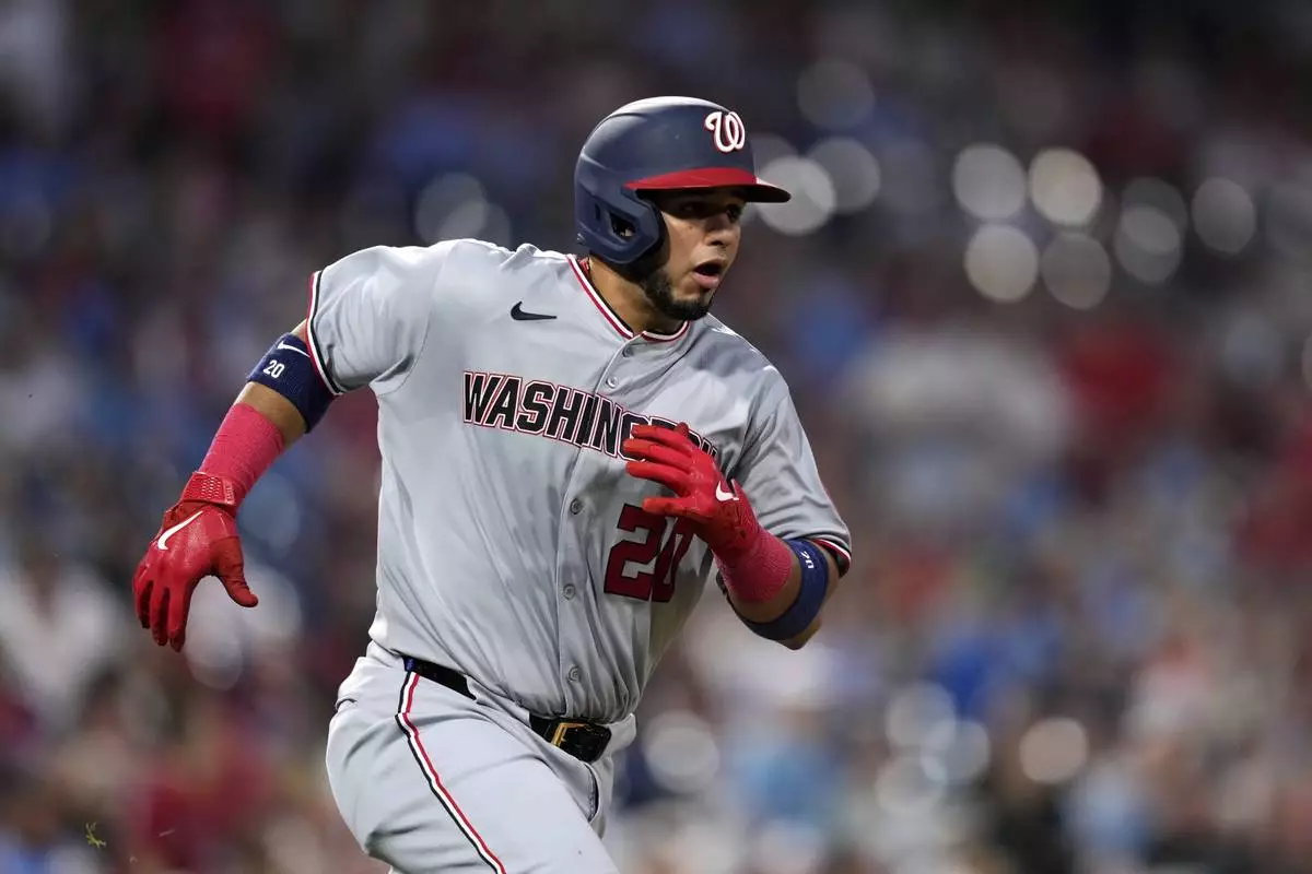 Washington Nationals' Keibert Ruiz runs to first after batting in a run on a fielding error by Philadelphia Phillies first baseman Bryce Harper during the sixth inning of a baseball game, Thursday, May 1, 2025, in Philadelphia. (AP Photo/Matt Slocum)