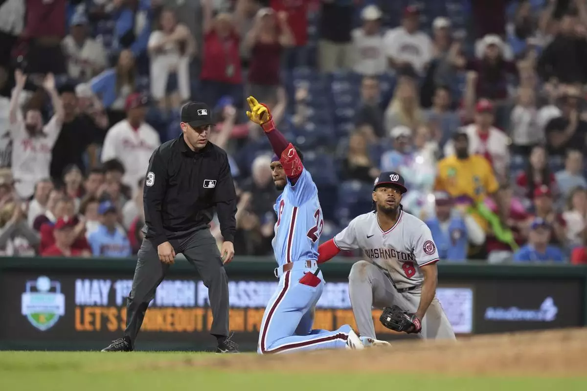 Philadelphia Phillies' Johan Rojas, center, reacts past Washington Nationals third baseman José Tena after hitting a triple during the ninth inning of a baseball game, Thursday, May 1, 2025, in Philadelphia. (AP Photo/Matt Slocum)