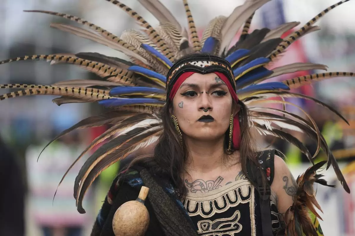 Jasmine Flores wears indigenous Mexican clothing as she and thousands of people march in a May Day rally and protest Thursday, May 1, 2025, in Chicago. (AP Photo/Erin Hooley)