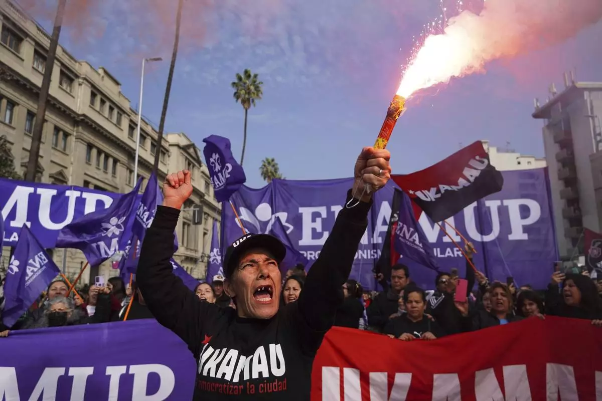 A protester holds a flare during an International Workers' Day march marking May Day in Santiago, Chile, Thursday, May 1, 2025. (AP Photo/Matias Basualdo)