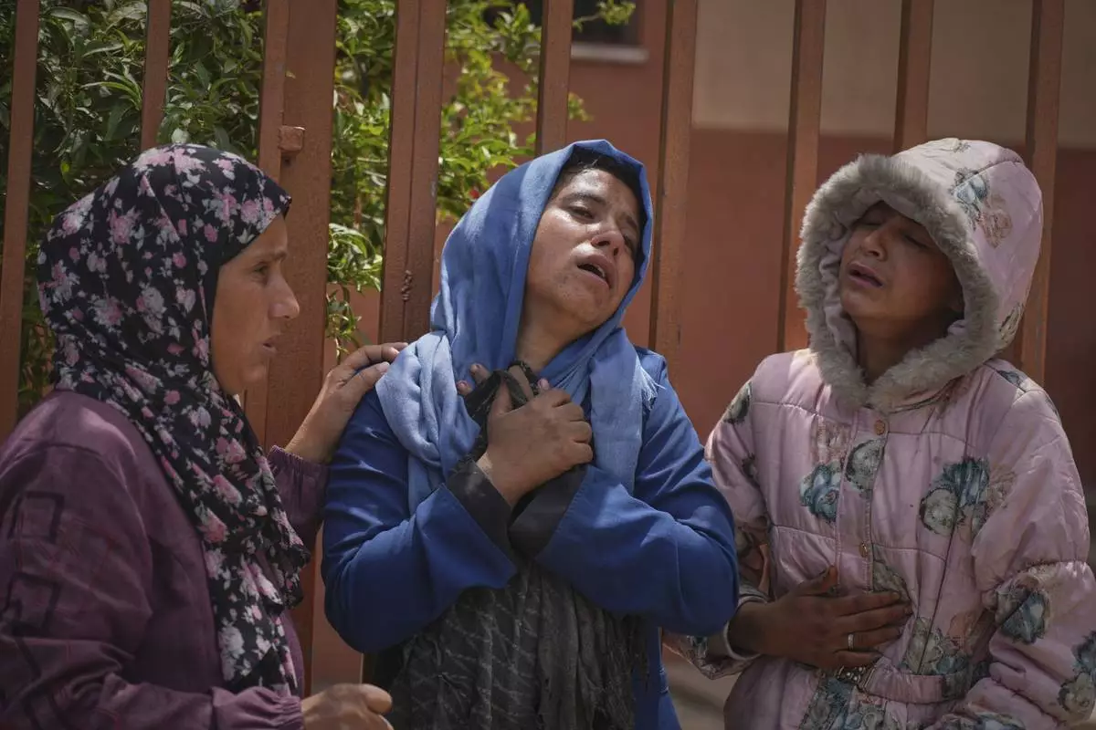Islam Abu Sahloul, center, mourns the death of her sister Lamia, 32, who was killed when an Israeli army strike hit a house killing at least five people, in Khan Younis, in the southern Gaza Strip, Thursday, May 1, 2025. (AP Photo/Abdel Kareem Hana)