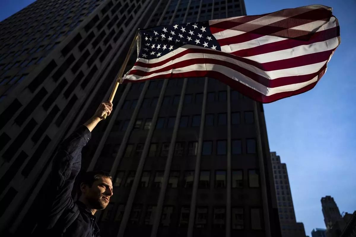 Thomas Slater waves an American flag during the NYCLU's May Day rally for workers and immigrants' rights, Thursday, May 1, 2025, in New York. (AP Photo/Angelina Katsanis)