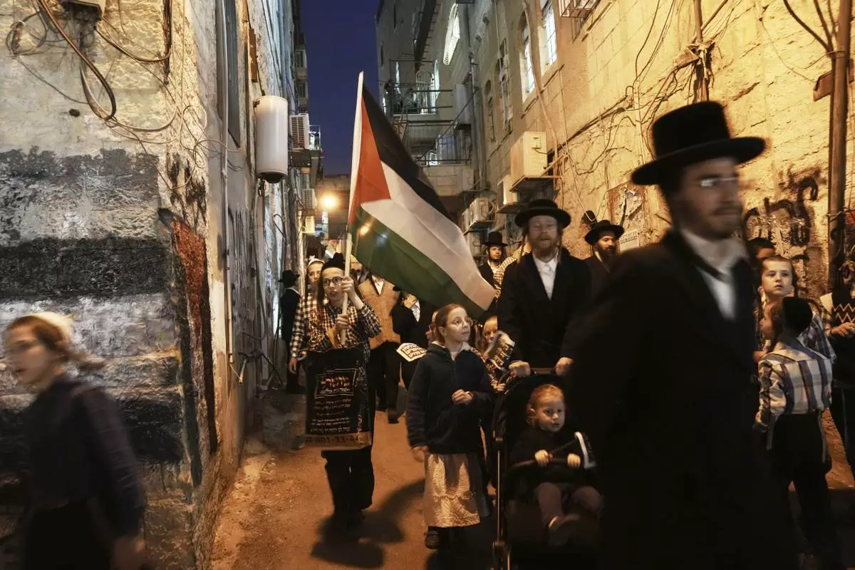 Ultra-Orthodox Jews who oppose Zionism and the Israeli state hold a procession with the Palestinian flag as they protest against Israel's 77th Independence Day, in the Mea Shearim neighborhood of Jerusalem, Thursday, May 1, 2025. (AP Photo/Mahmoud Illean)