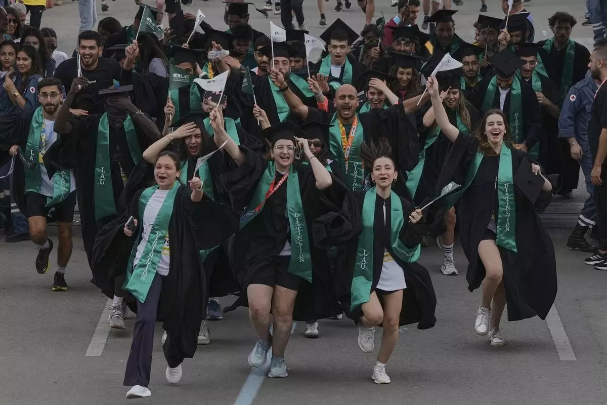 Graduating students runners participate in the 5 kilometers (3.1 miles) Fun Run of Beirut International Marathon in Beirut, Lebanon, Thursday, May 1, 2025. (AP Photo/Bilal Hussein)