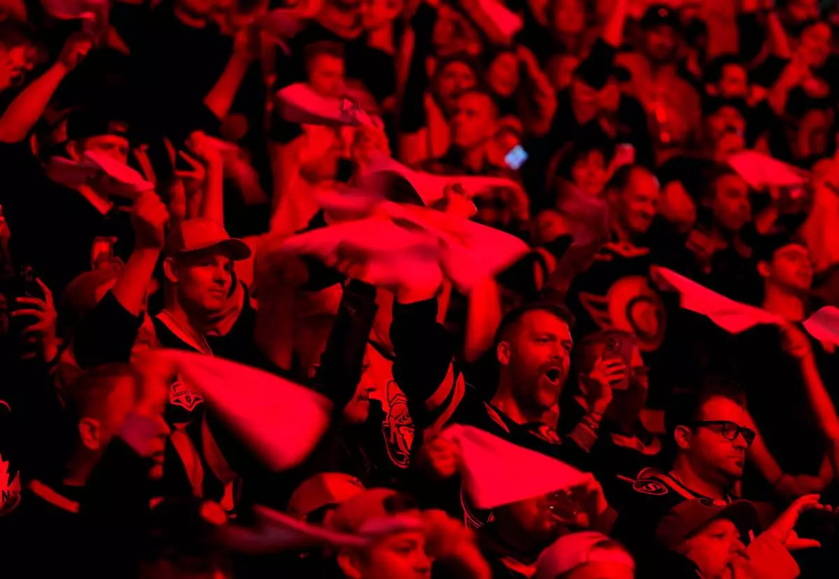 Ottawa Senators fans are bathed in red light as they wave towels before Game 6 of a first-round NHL hockey playoff series against the Toronto Maple Leafs in Ottawa, Ontario, Thursday, May 1, 2025. (Justin Tang/The Canadian Press via AP)