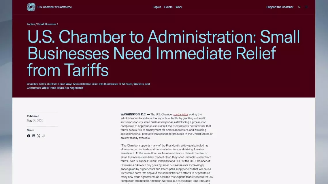 In a letter sent to the White House, the U.S. Chamber of Commerce warned of tariff hikes' "irreparable harm" to small businesses and a potential economic recession, calling for immediate tariff relief.
