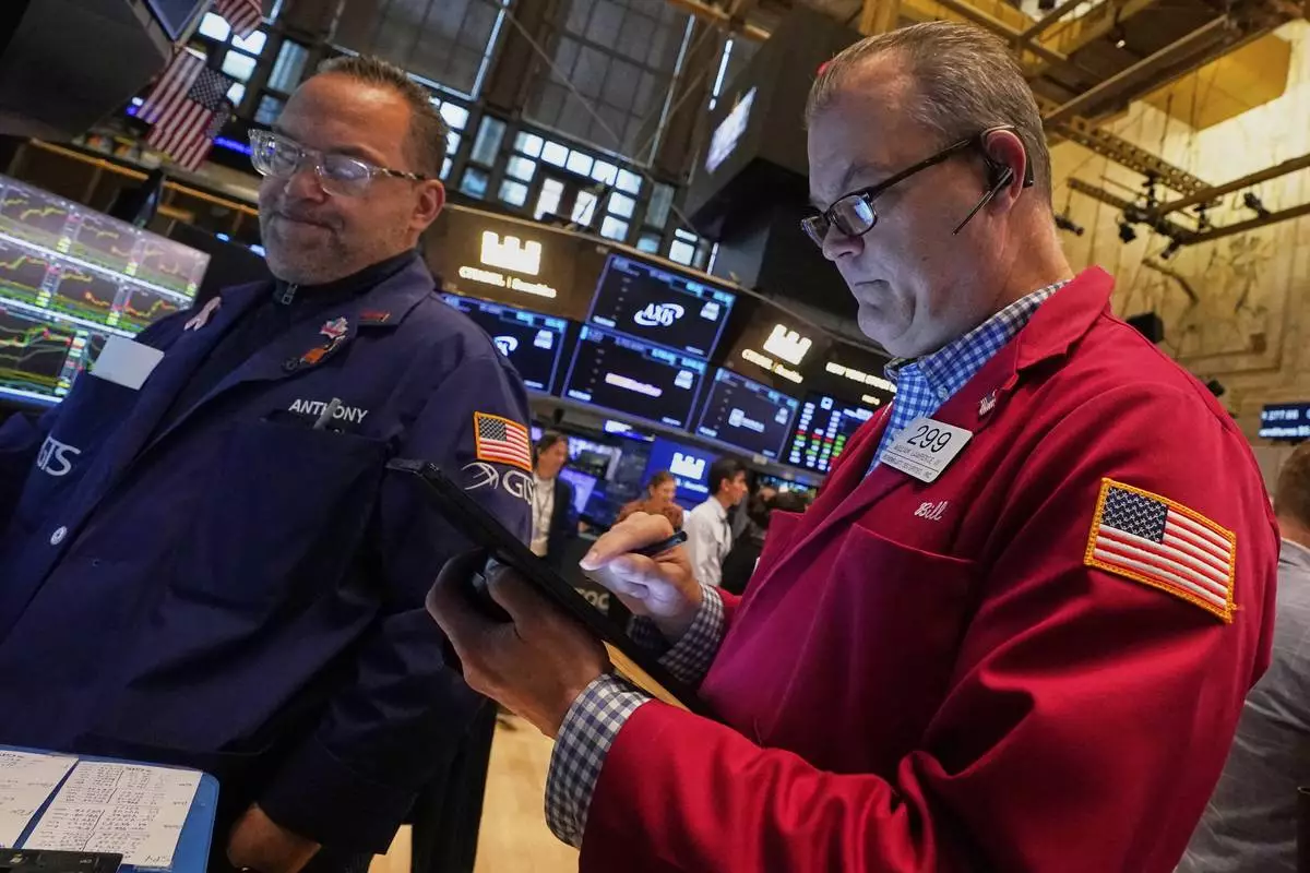 Specialists Meric Greenbaum, left, and Philip Finale confer on the floor of the New York Stock Exchange, Friday, May 2, 2025. (AP Photo/Richard Drew)