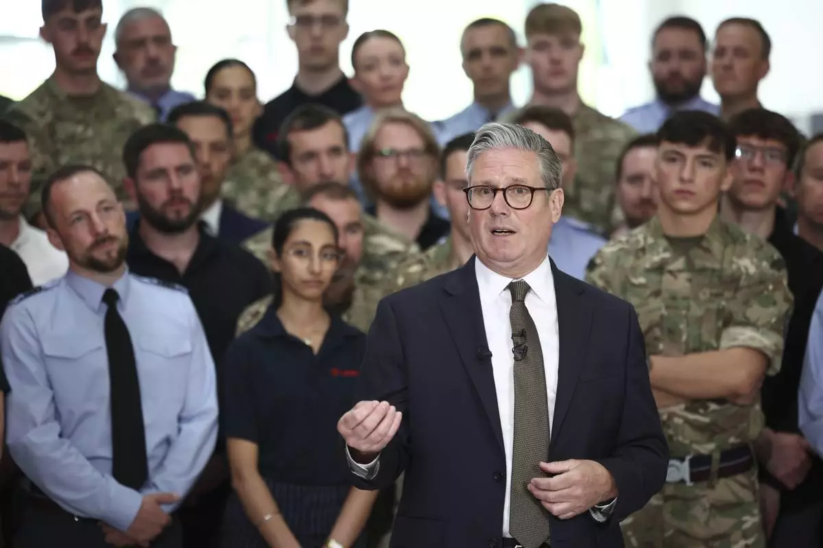 Britain's Prime Minister Keir Starmer speaks to members of staff during a visit to Leonardo, one of the biggest suppliers of defence and security equipment to the UK MOD, in Luton, England, Friday, May 2, 2025. (Henry Nicholls/Pool Photo via AP)