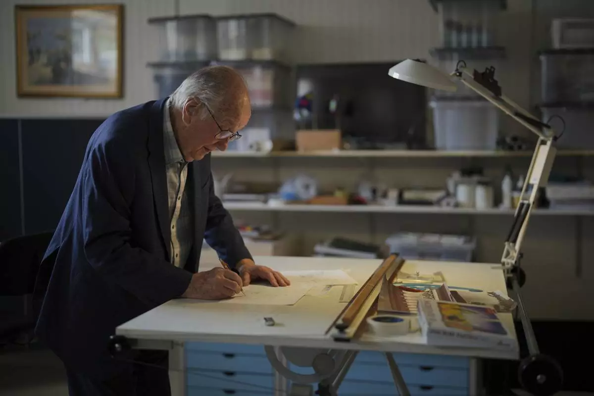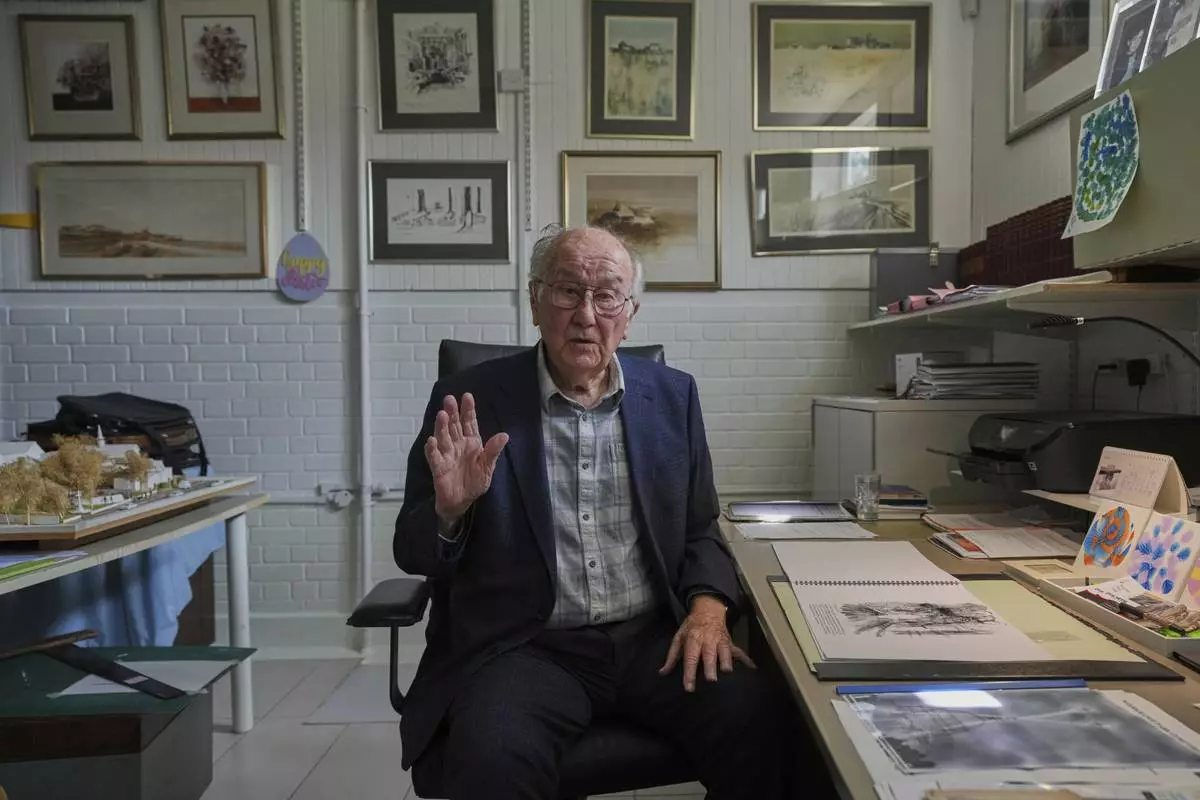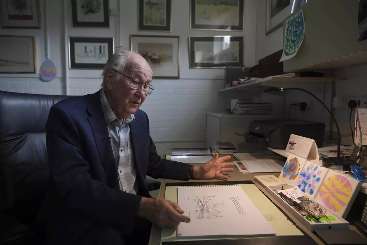 John Goldsmith, 94, draws during an interview at his home in London, Thursday, April 24, 2025. (AP Photo/Kin Cheung)