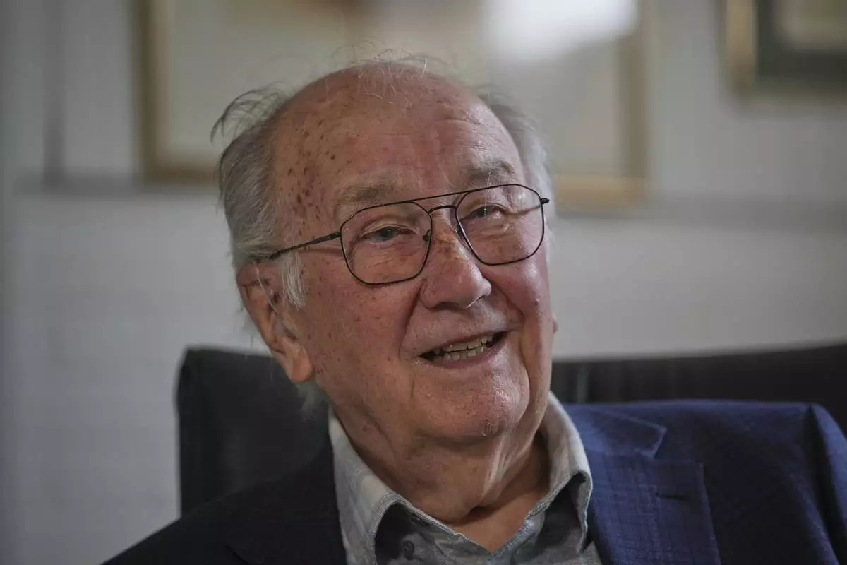 John Goldsmith, 94, speaks during an interview at his home in London, Thursday, April 24, 2025. (AP Photo/Kin Cheung)