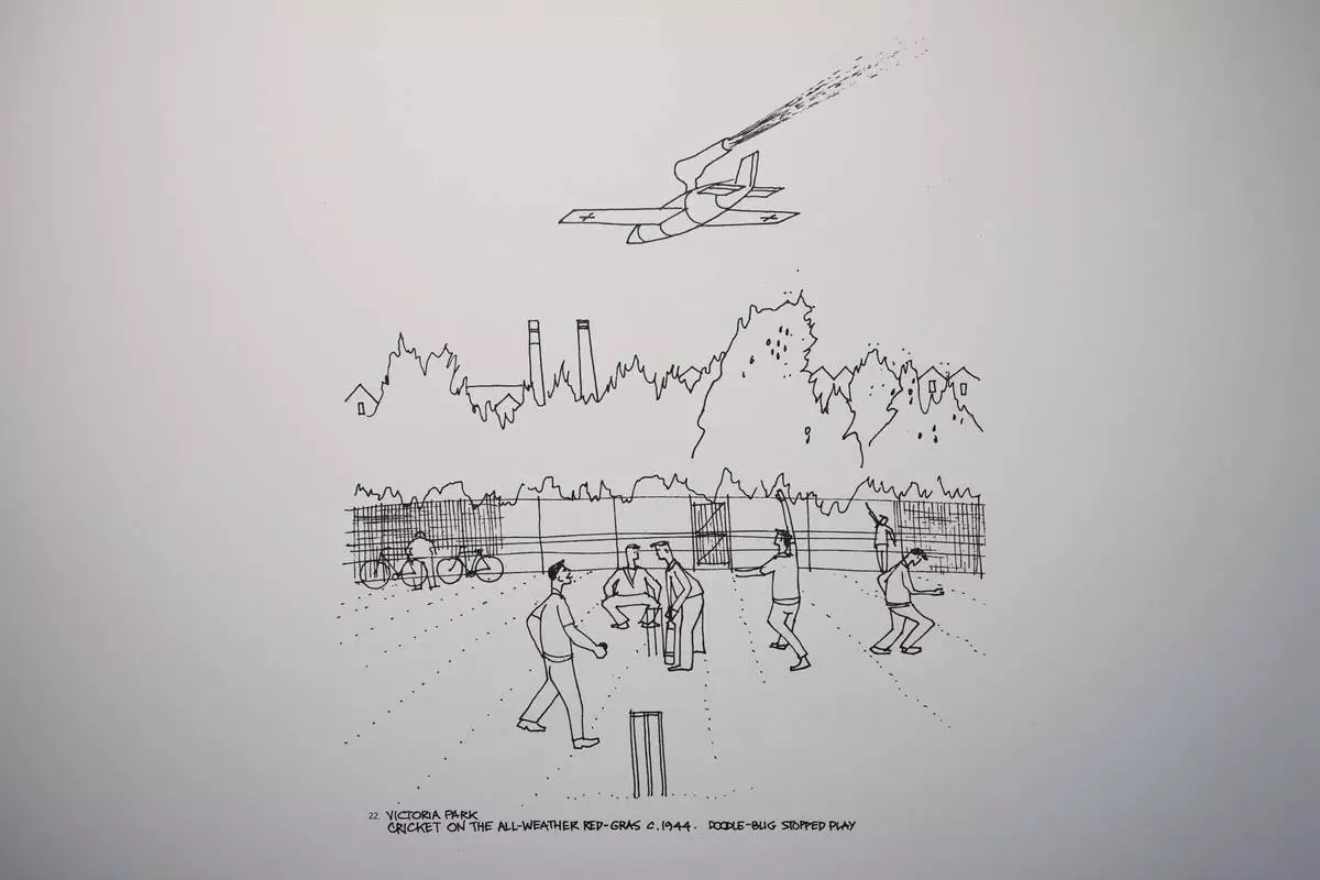 Goldsmith's drawings capture the day The Blitz began, with Nazi bombers filling the air and fires turning the night sky a molten volcanic red behind the docks. There's also the time a cricket match was suspended as one of the flying bombs known as “doodlebugs” soared overhead, and the ghostly image of a rent collector emerging from a cloud of dust after a V-2 rocket, a type of long-range ballistic missile, obliterated a block of houses.