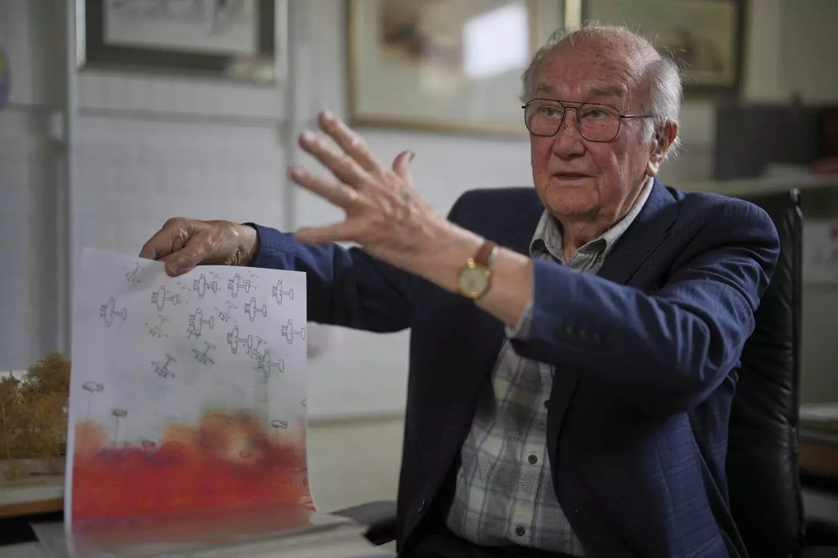 John Goldsmith, 94, shows his drawing during an interview at his home in London, Thursday, April 24, 2025. (AP Photo/Kin Cheung)
