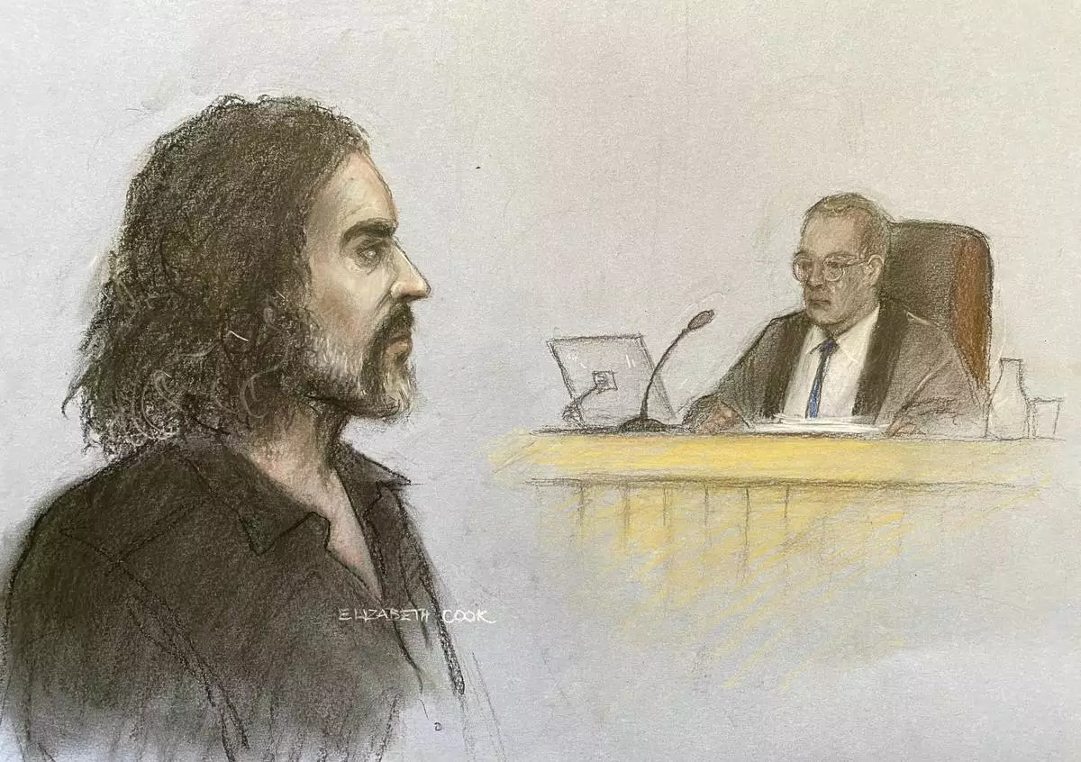 This court artist drawing by Elizabeth Cook shows Russell Brand appearing in the dock at Westminster Magistrates' Court, London, Friday, May 2, 2025, where he is charged with with one count each of rape, indecent assault and oral rape, as well as two counts of sexual assault, relating to four separate women. (Elizabeth Cook/PA via AP)