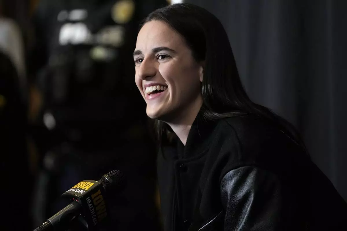 FILE = Former Iowa guard and current Indiana Fever WNBA player Caitlin Clark speaks during a news conference before an NCAA college basketball game between Iowa and USC, Sunday, Feb. 2, 2025, in Iowa City, Iowa. (AP Photo/Charlie Neibergall, File)