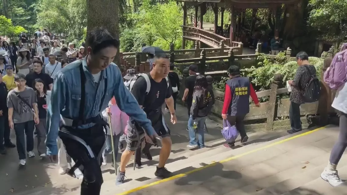 Tourists visiting the Mount Qingcheng are testing the exoskeleton robot, a wearable device designed to ease physical demands during climbs.