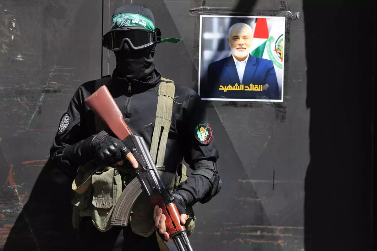 FILE - A Hamas fighter stands next of a portrait that shows former Hamas political leader Ismail Haniyeh, as he attends the funeral procession of Samer al-Haj, a Hamas official who was killed by an Israeli drone strike, at Ein el-Hilweh Palestinian refugee camp, in the southern port city of Sidon, Aug. 10, 2024. (AP Photo/Mohammed Zaatari, File)