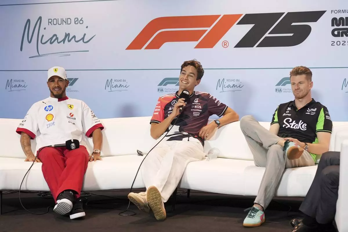 Mercedes driver George Russell, center, of Britain, answers a question as Ferrari driver Lewis Hamilton. left, also of Britain and Kick Sauber driver Nico Hulkenberg, right, of Germany, listen during a news conference ahead of the Formula One Miami Grand Prix auto race, Thursday, May 1, 2025, in Miami Gardens, Fla. (AP Photo/Rebecca Blackwell)