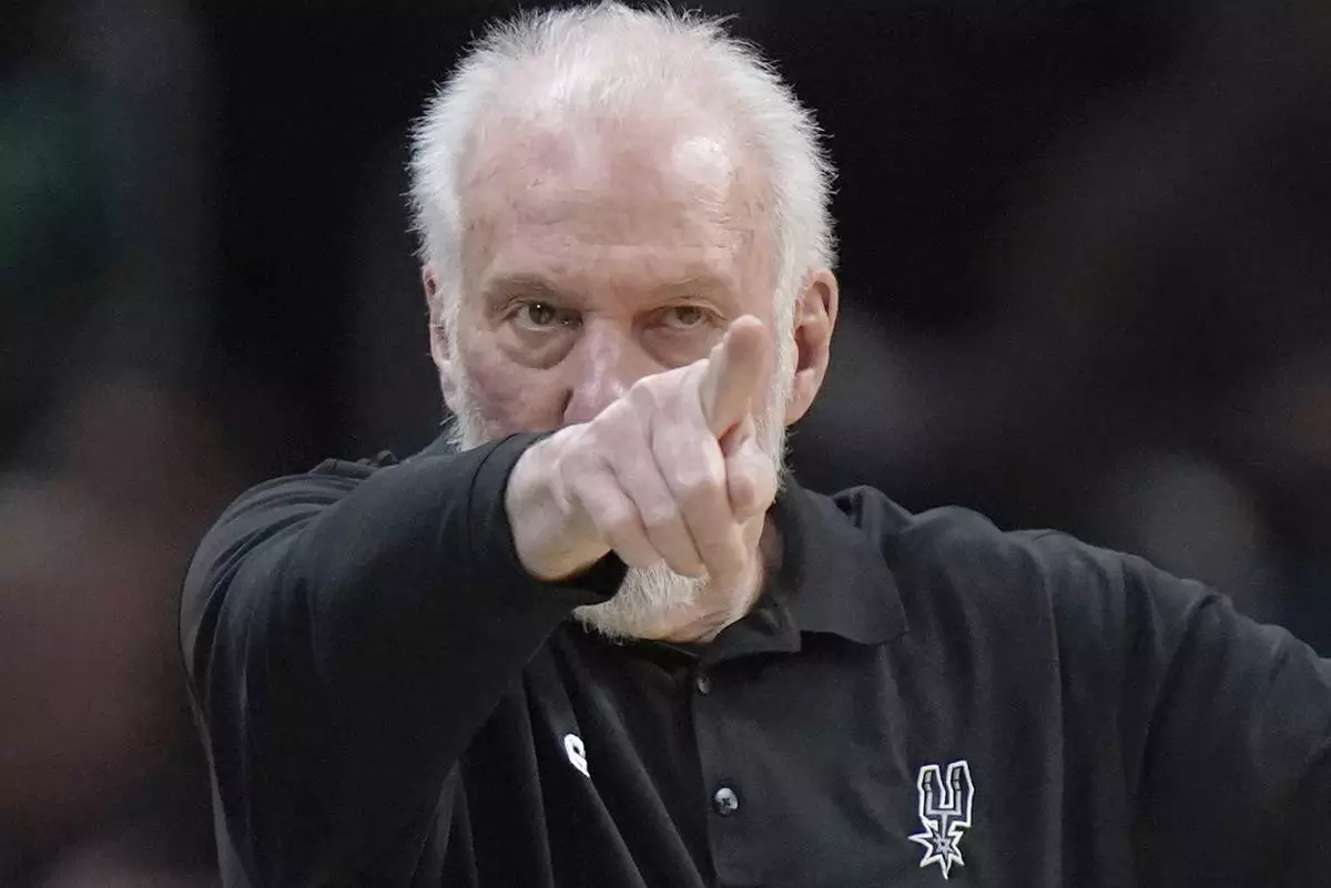 FILE - San Antonio Spurs head coach Gregg Popovich points from the bench in the second half of an NBA basketball game against the Boston Celtics, Sunday, March 26, 2023, in Boston. (AP Photo/Steven Senne, File)