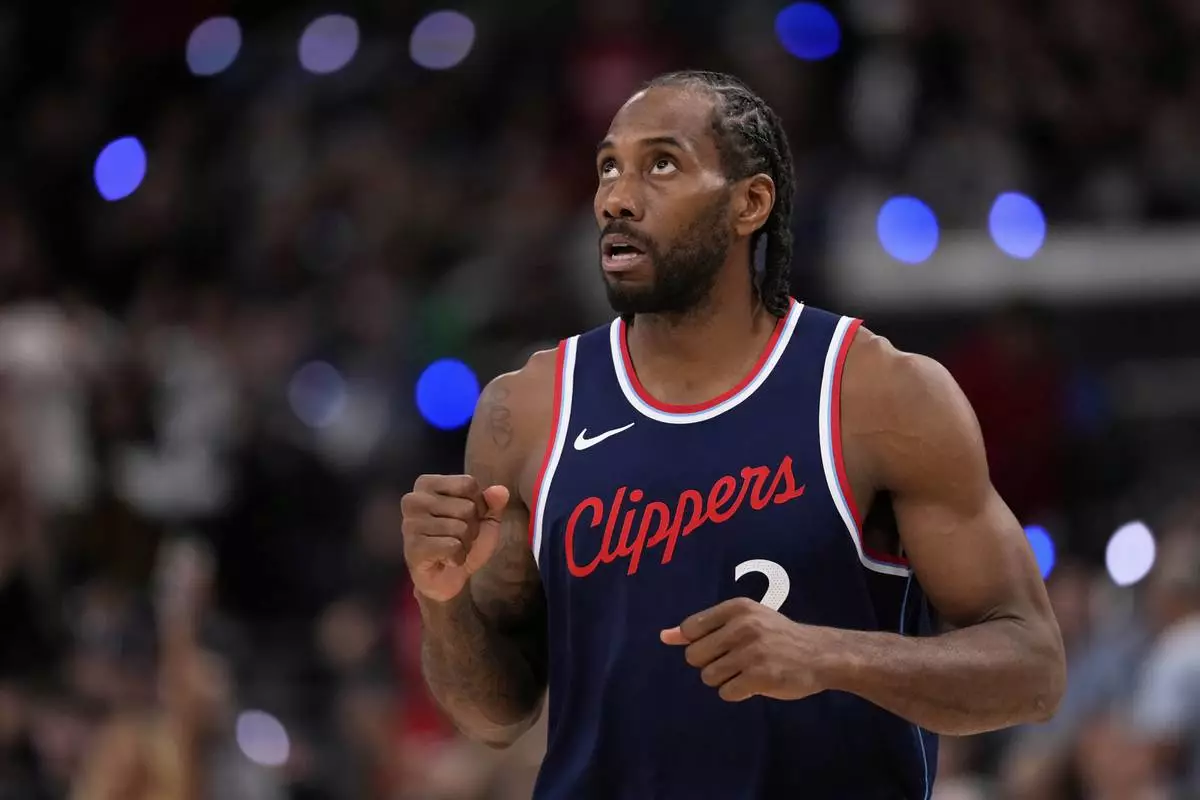 Los Angeles Clippers forward Kawhi Leonard celebrates after scoring during the second half in Game 6 of an NBA basketball first-round playoff series against the Denver Nuggets, Thursday, May 1, 2025, in Inglewood, Calif. (AP Photo/Mark J. Terrill)