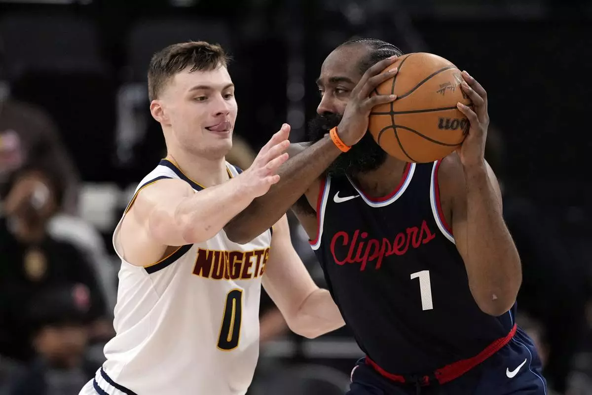 Los Angeles Clippers guard James Harden, right, tries to pass while under pressure from Denver Nuggets guard Christian Braun during the second half in Game 6 of an NBA basketball first-round playoff series Thursday, May 1, 2025, in Inglewood, Calif. (AP Photo/Mark J. Terrill)