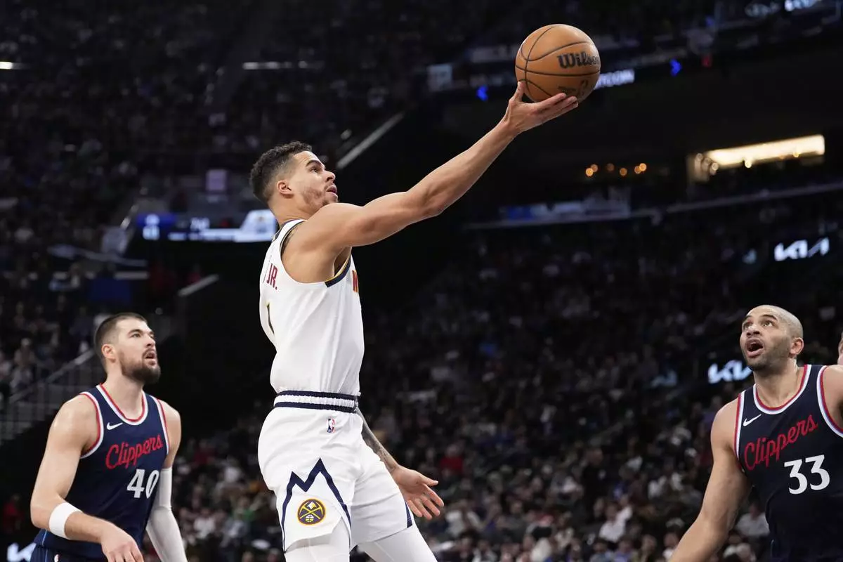 Denver Nuggets forward Michael Porter Jr., center, shoots as Los Angeles Clippers center Ivica Zubac, left, and forward Nicolas Batum defend during the second half in Game 6 of an NBA basketball first-round playoff series Thursday, May 1, 2025, in Inglewood, Calif. (AP Photo/Mark J. Terrill)
