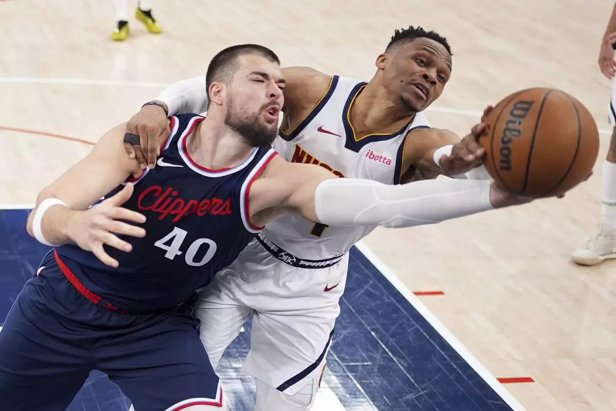 Los Angeles Clippers center Ivica Zubac, left, and Denver Nuggets guard Russell Westbrook reach for a rebound during the second half in Game 6 of an NBA basketball first-round playoff series Thursday, May 1, 2025, in Inglewood, Calif. (AP Photo/Mark J. Terrill)