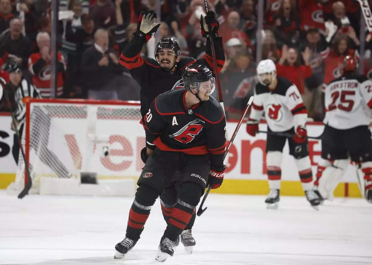 Nearly a full game’s worth of action later, the Hurricanes were again pressing an advantage after a double-minor penalty when Aho delivered another one-timer, this blast closing out their playoff series against New Jersey.