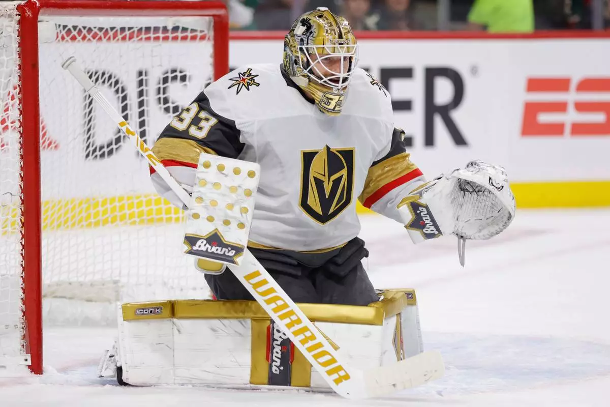 Vegas Golden Knights goaltender Adin Hill watches the play during the first period of Game 6 of a first-round NHL hockey playoff series against the Minnesota Wild, Thursday, May 1, 2025, in St. Paul, Minn. (AP Photo/Bailey Hillesheim)