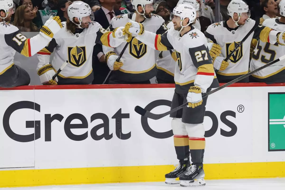 Vegas Golden Knights defenseman Shea Theodore (27) is congratulated by teammates after scoring a power play goal during the first period of Game 6 of a first-round NHL hockey playoff series against the Minnesota Wild, Thursday, May 1, 2025, in St. Paul, Minn. (AP Photo/Bailey Hillesheim)